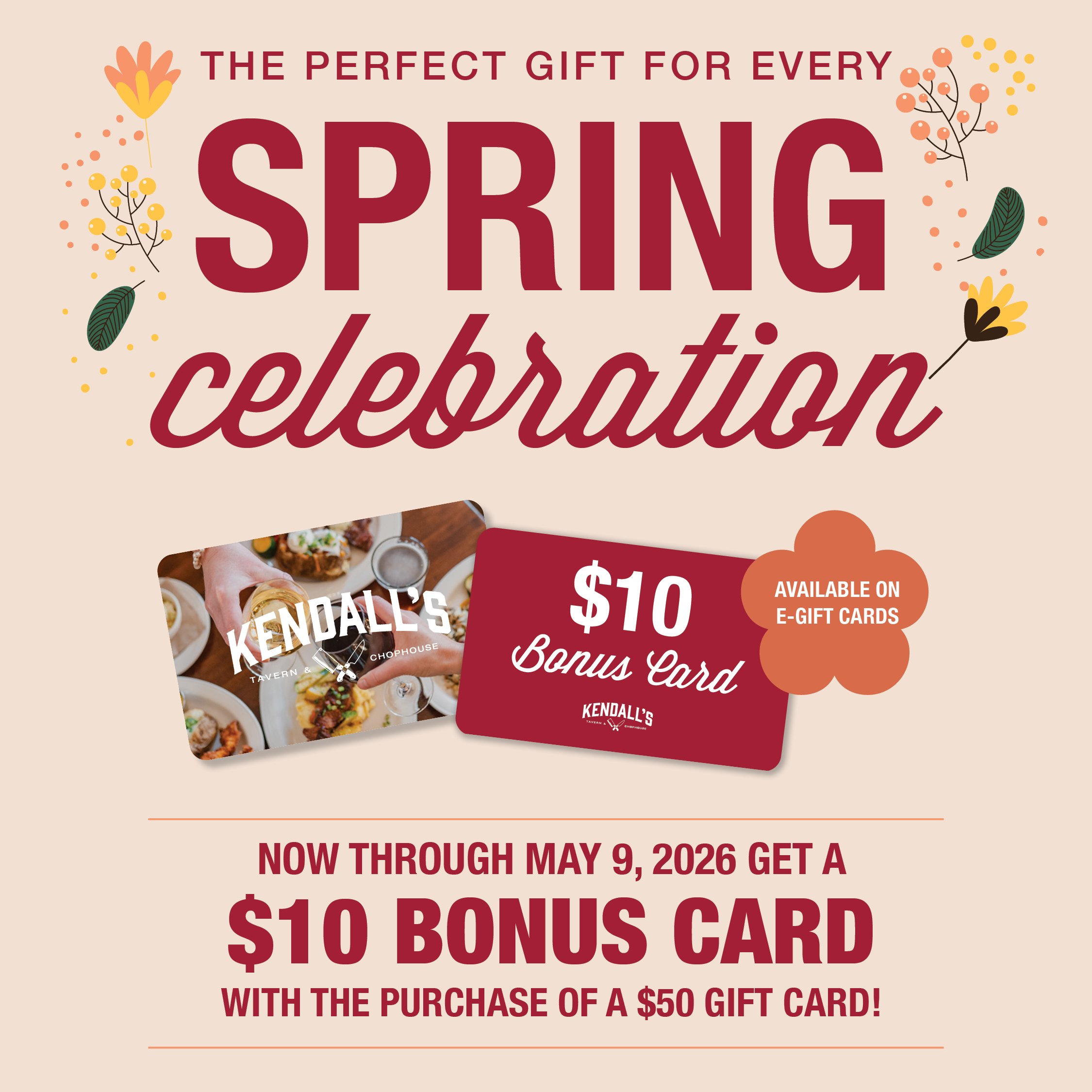 *Bonus cards hold no cash value, nor will credit be applied for any balances. Not valid with other offers or promotions. Kendall’s Tavern & Chophouse and Morrissey Hospitality are not responsible for lost or stolen cards. Valid for purchases now through October 31, 2026.